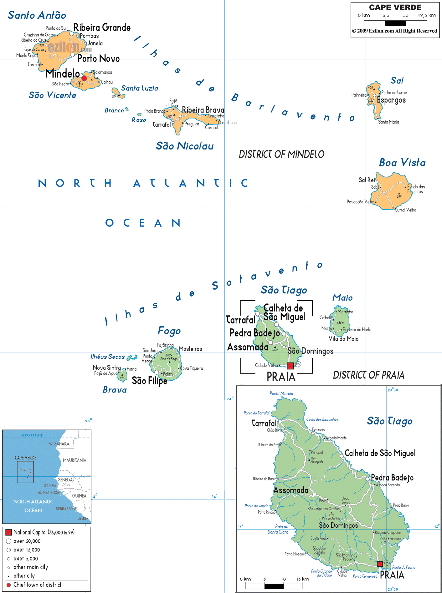 The island of Santiago offers a lush and festive atmosphere, while Boa Vista is a peaceful island for those who prefer scuba diving and direct contact with Nature. Other larger islands are São Vicente, Santo Antão, São Nicolau, Santa Luzia, Sal, Maio, Fogo and Brava while the smaller sized ones are Branco, Raso Rei and Rombo. All these islands offer spectacular views from their mountain peaks the highest of which is Pico do Cano, while the volcano on Fogo is still active.